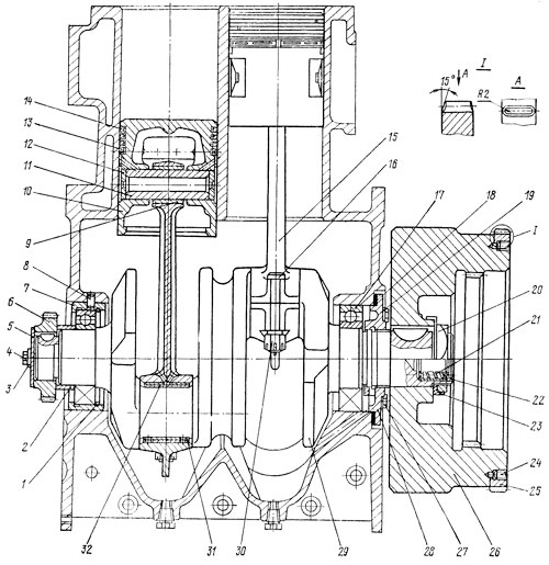 Заведите шатун с болтами 16 нижней головки на шатунную шейку коленчатого вала. Установите крышку по ранее нанесенным меткам. Крышку с шатуном собирайте так, чтобы пазы под усики вкладышей находились с одной стороны. Закрепите крышку к шатуну, навернув на шатунные болты гайки 30.