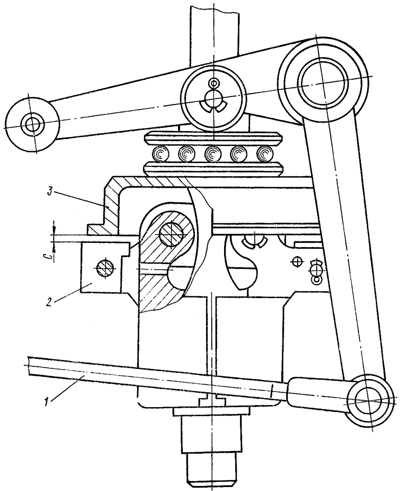 Прижмите до отказа грузы регулятора к вертикальному валику регулятора, а муфту прижмите до отказа к роликам рычагов. Проверьте зазор С между муфтой 3 ( рис. 182 ) регулятора и сухариками 2, который должен быть в пределах 1,5...3 мм. Если зазор больше или меньше, то соответственно увеличьте или уменьшите длину тяги.