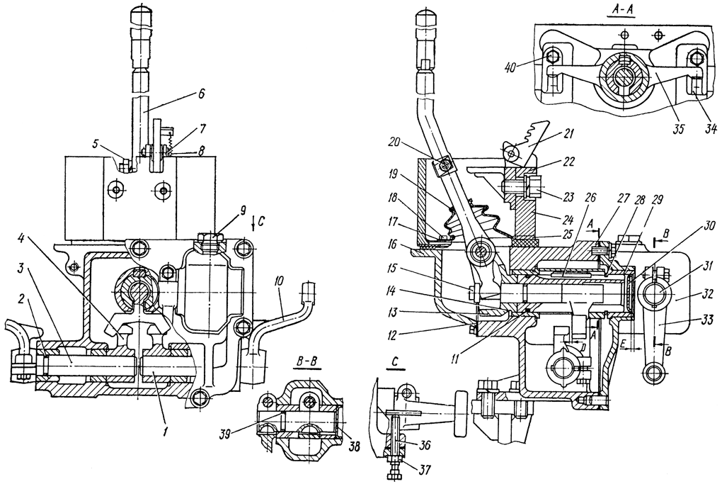 На свободный конец валика посадите шпонку и закрепите внутренний рычаг 4 стяжным болтом рычага. Вращение валика 5 в опорных втулках корпуса должно быть свободным, без заеданий; Аналогично соберите валик 1 с рычагом 10 и введите в наружную втулку с другой стороны корпуса. Посадите шпонку на валик 1 и, совместив ее с пазами внутренней втулки и рычага, продвиньте валик в корпус. Закрепите внутренний рычаг стяжным болтом. Вверните регулировочные болты 36 с гайкой 37 в отверстия корпуса.