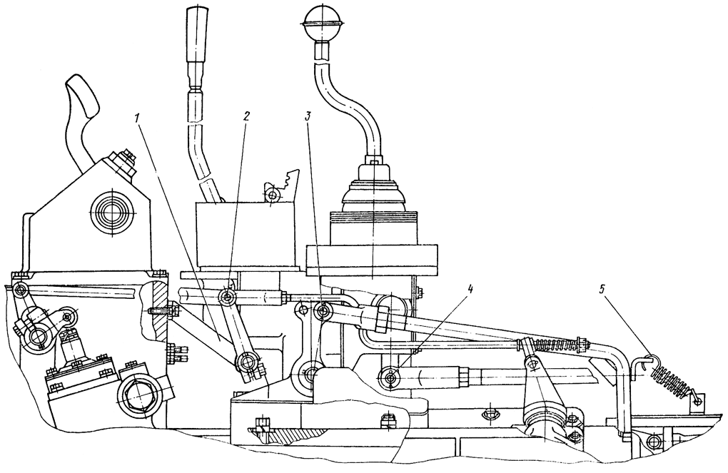 Отсоедините пружины 5 от тяг управления тормозами. Расшплинтуйте и выбейте пальцы 3, соединяющие тяги управления тормозами с рычагами механизма управления поворотом. Отсоедините от правого рычага тягу педали тормоза. Отверните четыре болта крепления механизма управления поворотом и снимите его с опоры.