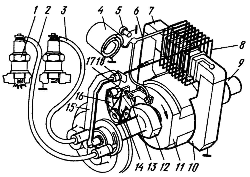 В свечах нет искры Проверить наличие искры на зажимах проводов свечей. Если на одном из зажимов нет искры, то испорчены провод или его контакт в подсоединении к магнето. При наличии искры на обоих зажимах убедиться в исправности свечей. Если после проверки проводов и контакта подсоединения проводов к магнето нет искры на зажимах свечей, то неисправно магнето. В этом случае следует снять магнето для ремонта