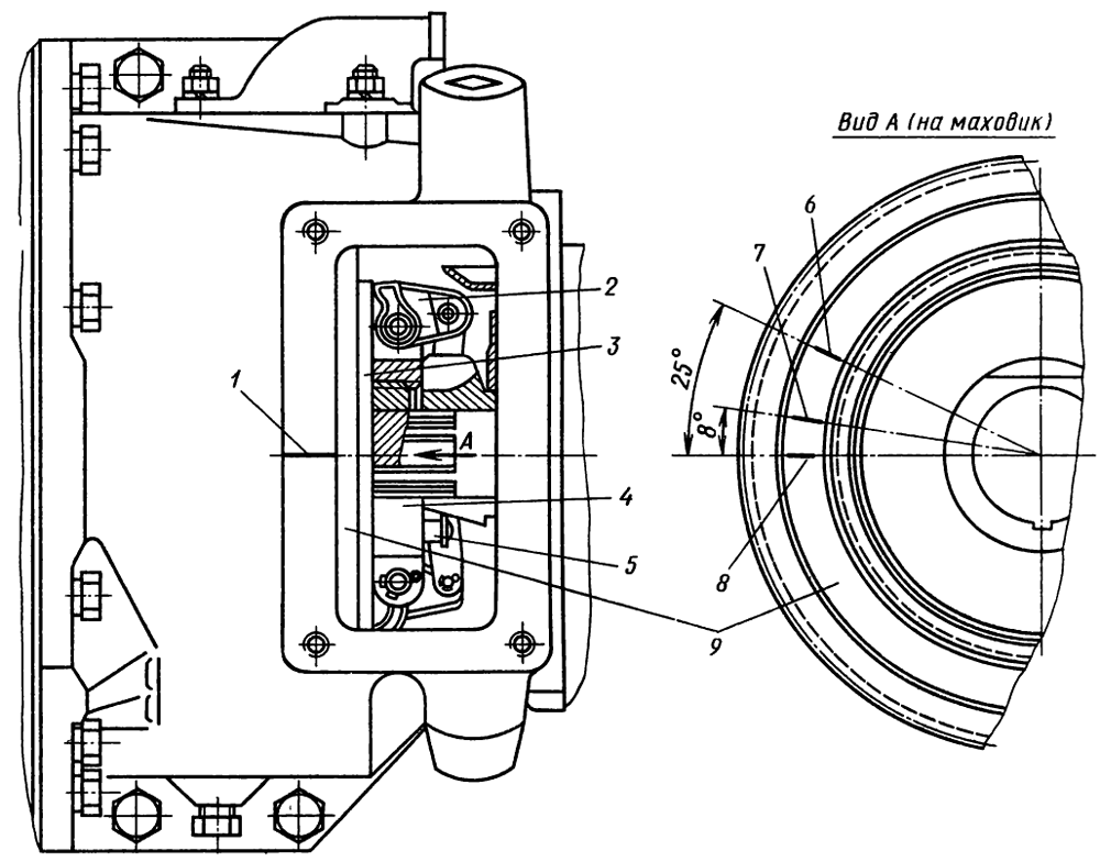 В корпусе редуктора следует периодически заменять масло согласно карте смазывания. Механизм включения должен быть отрегулирован на момент выхода его шестерни из зацепления с венцом маховика дизеля. Для регулировки вращают два регулировочных винта 18 в защелках до тех пор, пока частота вращения вала дизеля, при которой происходит выход из зацепления шестерни с венцом маховика, станет равной 300—320 мин-1. После регулировки винты следует законтрить шплинтами.